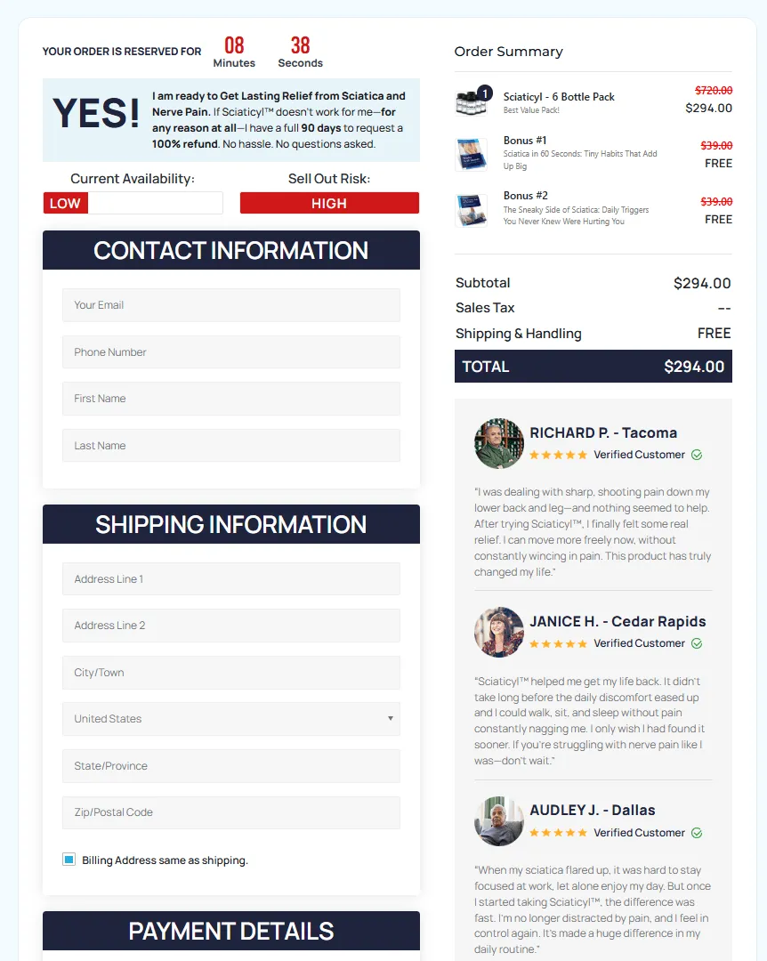 Sciaticyl™ is a natural dietary supplement formulated to relieve sciatic nerve pain, support nerve health, and enhance mobility. It’s ideal for those dealing with lower back pain, leg numbness, or tingling caused by sciatica or nerve compression.